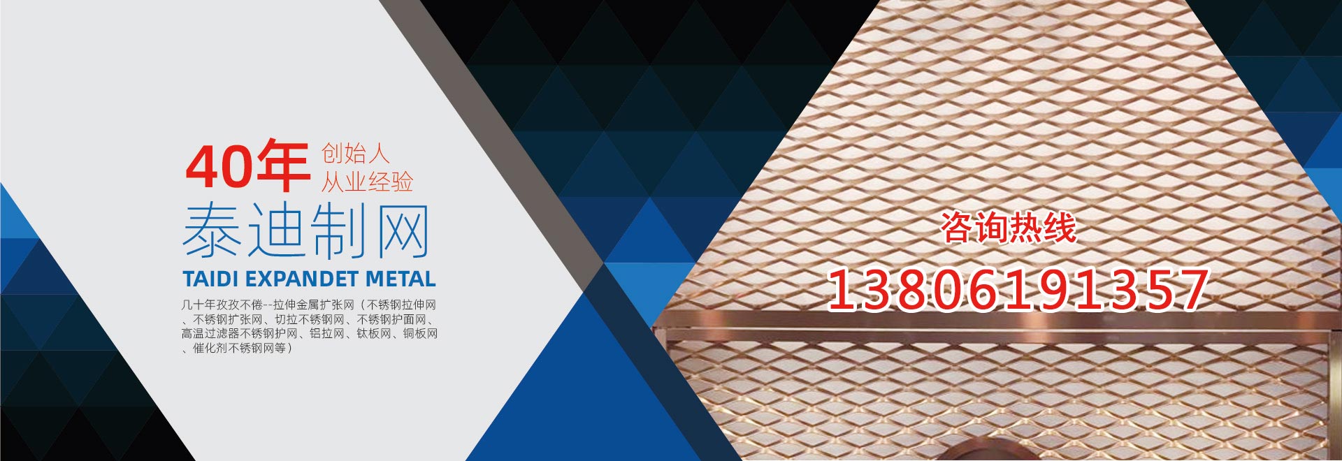 無錫泰迪環保科技有限公司,是一家專業生產金屬拉伸擴張網的企業。公司特長是:不銹鋼擴張網、拉伸擴張小孔、微孔網、奧氏體不銹鋼304、316網、超奧氏體不銹鋼網、鎳基不銹鋼的切拉擴張網生產、加工。產品包括:不銹鋼拉伸網、不銹鋼擴張網、切拉不銹鋼網、不銹鋼護面網、高溫過濾器不銹鋼護網、 板式催化劑不銹鋼網。復合針孔鋁板、針孔鋁拉網、微孔鋁板、微孔吸音鋁板、針孔吸音鋁板、微穿孔不銹鋼網、不銹鋼電池集流網、電池用不銹鋼網、鈦板網、不銹鋼板網、鎳板網、銅板網。鉛板網、超奧氏體不銹鋼板網、鎳基不銹鋼板網,鋁拉網、鋁板拉伸網、拉伸屏蔽網、不銹鋼過濾器網、不銹鋼過濾網,不銹鋼濾芯網、濾筒不銹鋼網,音箱喇叭網罩。公司前身為13年成立的無錫泰迪金屬制品有限公司。公司創始人陳正芳先生從事切拉擴張網專業四十年,公司產品在總工程師繆志明(原上海中國鋼板網廠工程師)指導下,一直保持優良品質。